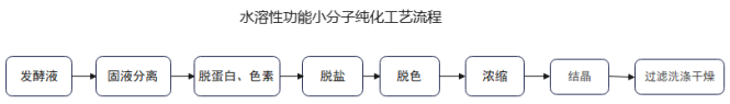微生物发酵法生产功能性小分子具有快速高效、产品纯度高、成本低等特点。这些功能性小分子的分离纯化,通常历经固液分离、脱宿主细胞蛋白HCP、脱宿主细胞DNA,脱色、脱盐、浓缩、结晶等。常见工艺流程如下: