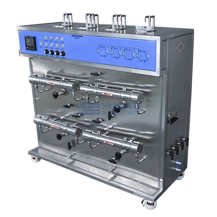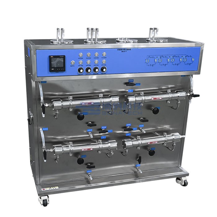 四级膜分离过滤系统(DMJ60-4)可换装陶瓷膜元件,有机微滤、超滤、纳滤、反渗透膜元件。可以实现单级过滤,也可以实现多级连续同时过滤