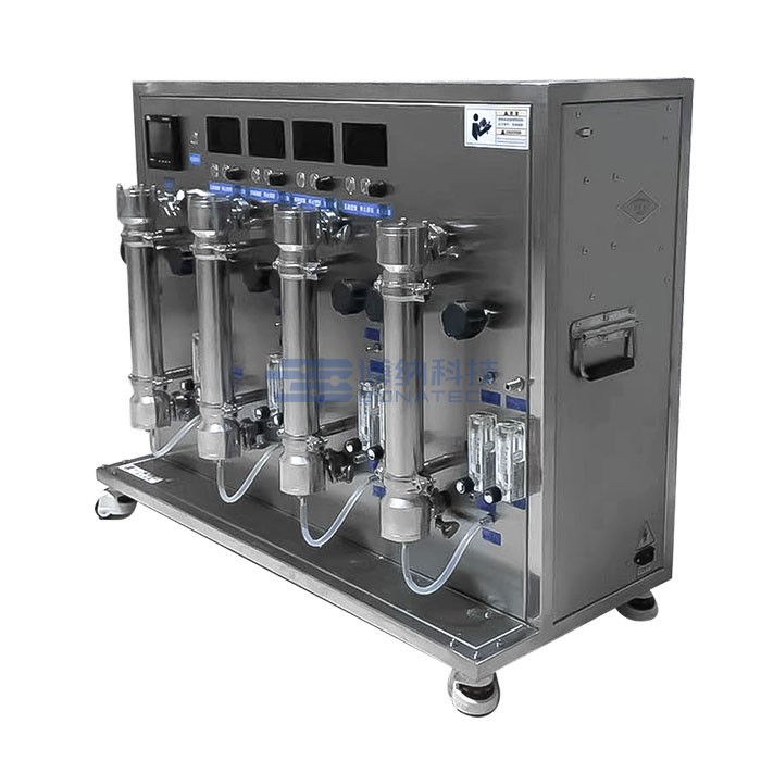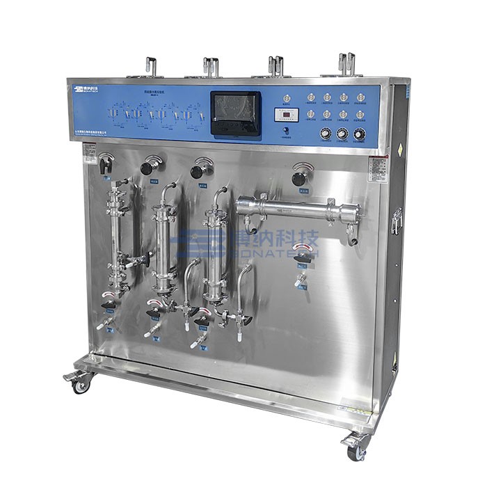 四级膜分离过滤系统(DMJ60-4)可换装陶瓷膜元件,有机微滤、超滤、纳滤、反渗透膜元件。可以实现单级过滤,也可以实现多级连续同时过滤;可在同一时间,同时启动陶瓷膜过滤、超滤、纳滤膜,反渗透膜完成产品溶液的澄清过滤,分级超滤、纳滤浓缩除盐、脱醇、反渗透浓缩;同一时间段内完成产品溶液按照分子量大小分段收集,整个过程连续可控;浓缩液和清夜单独进行收集。