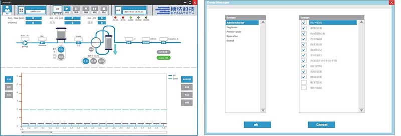 流量计控制泵速,精准可靠,实时记录压力、pH、电导率、UV等信号。完善的权限管理、审计追踪、电子签名, 全面符合 21 CFR Part 11 要求。