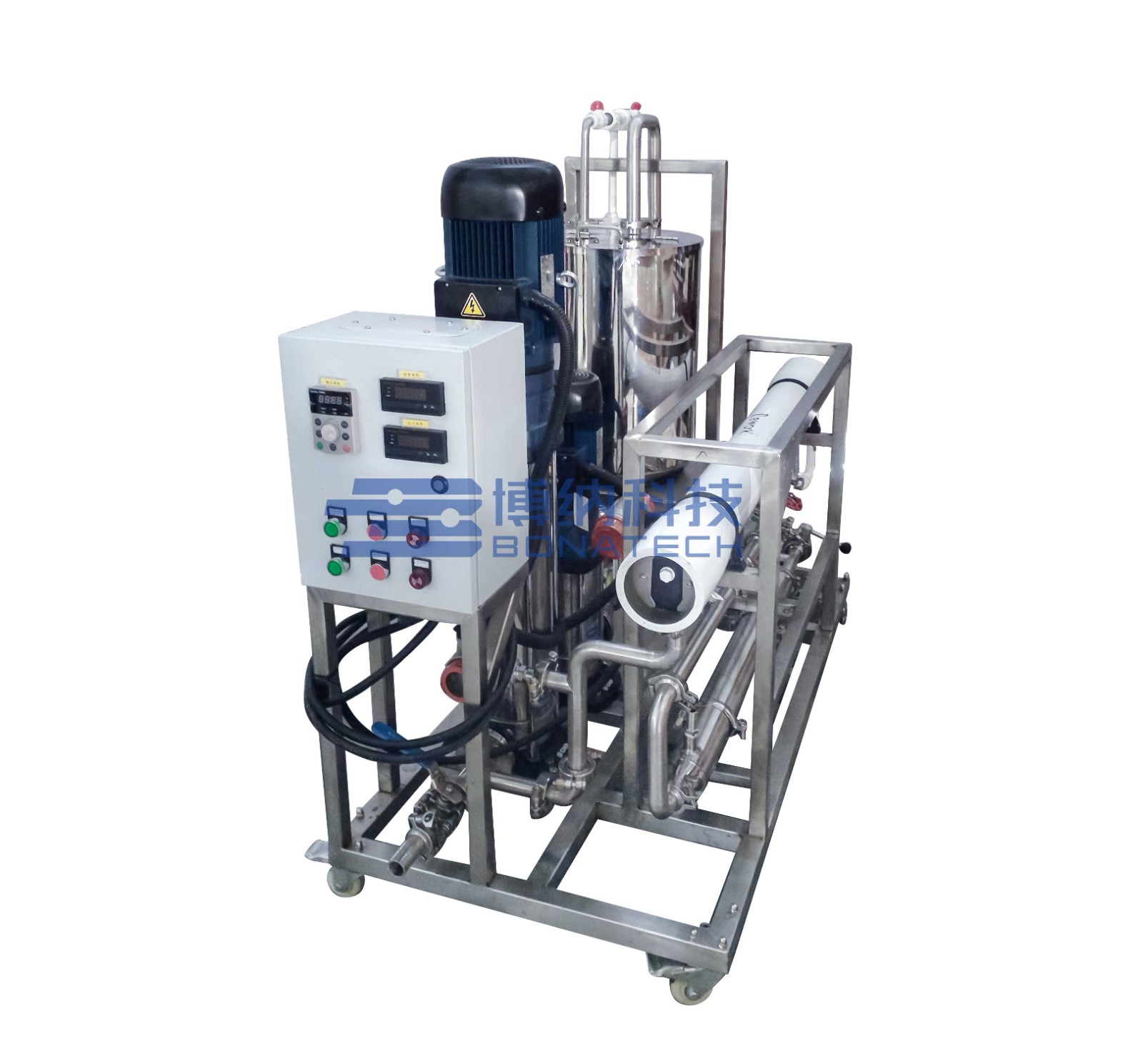 有机膜过滤中试系统(BONA-GM-4040H)具有抗污能力强、易清洗、耐高压等特点,可以换装微滤、超滤、纳滤膜元件,广泛应用于发酵、植物提取、食品饮料、生物制药、化工、环保等多个交叉领域分离与净化。